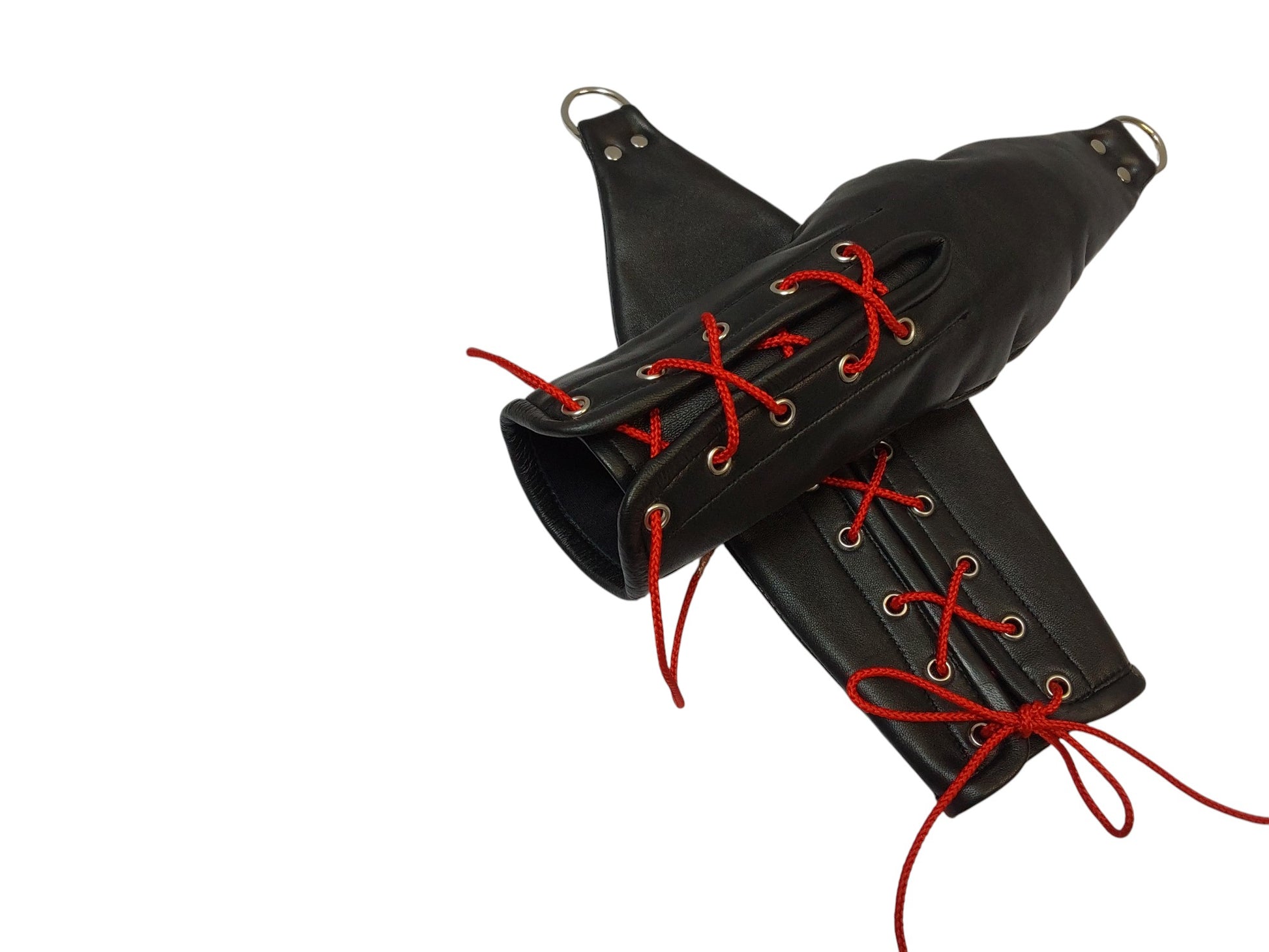 Minimal-slip restraint mittens that immobilise the hands for secure, comfortable control. Hand-crafted leather shells, lace-up closure for a snug wrap, and an integrated D-ring for tethering or accessories. Sold as a pair.