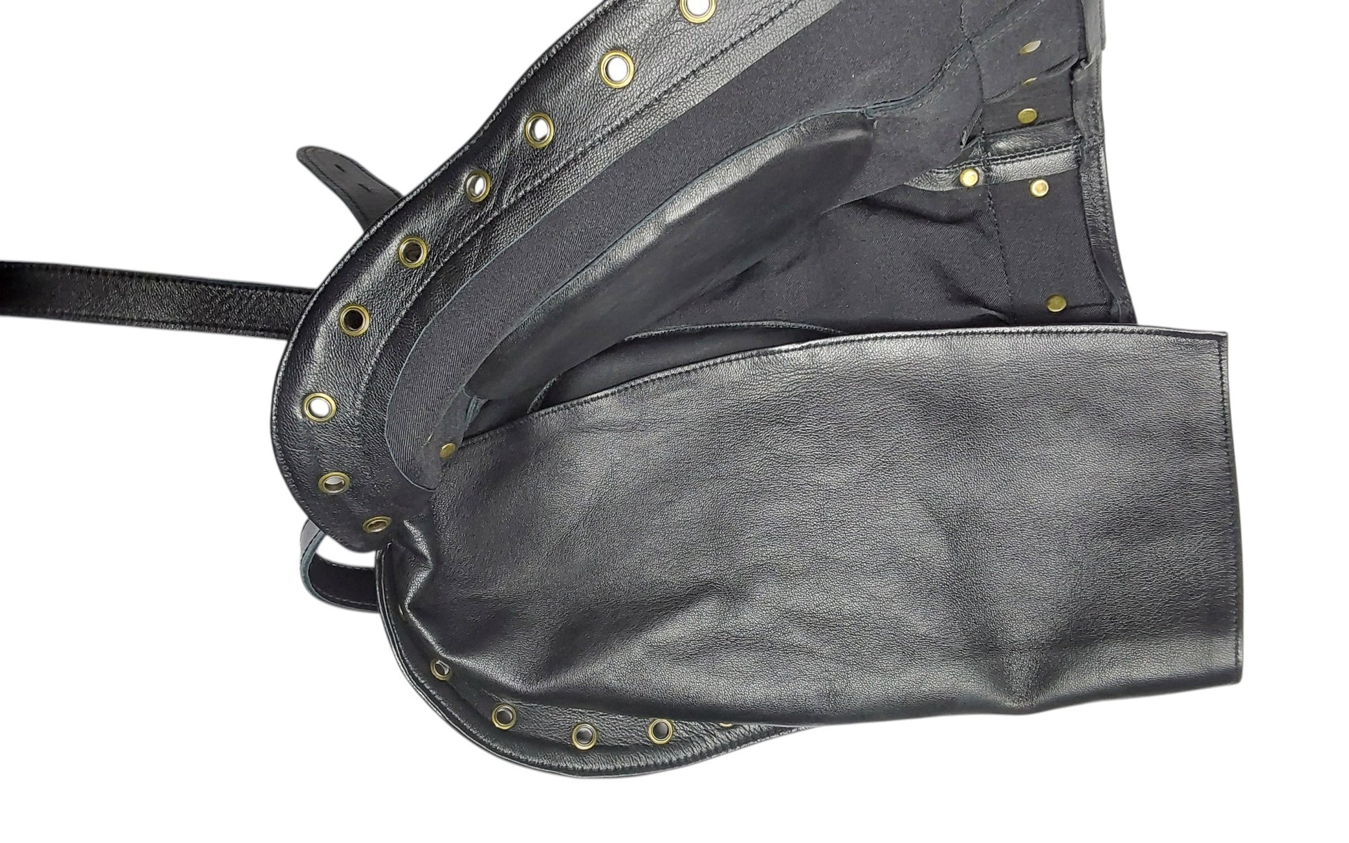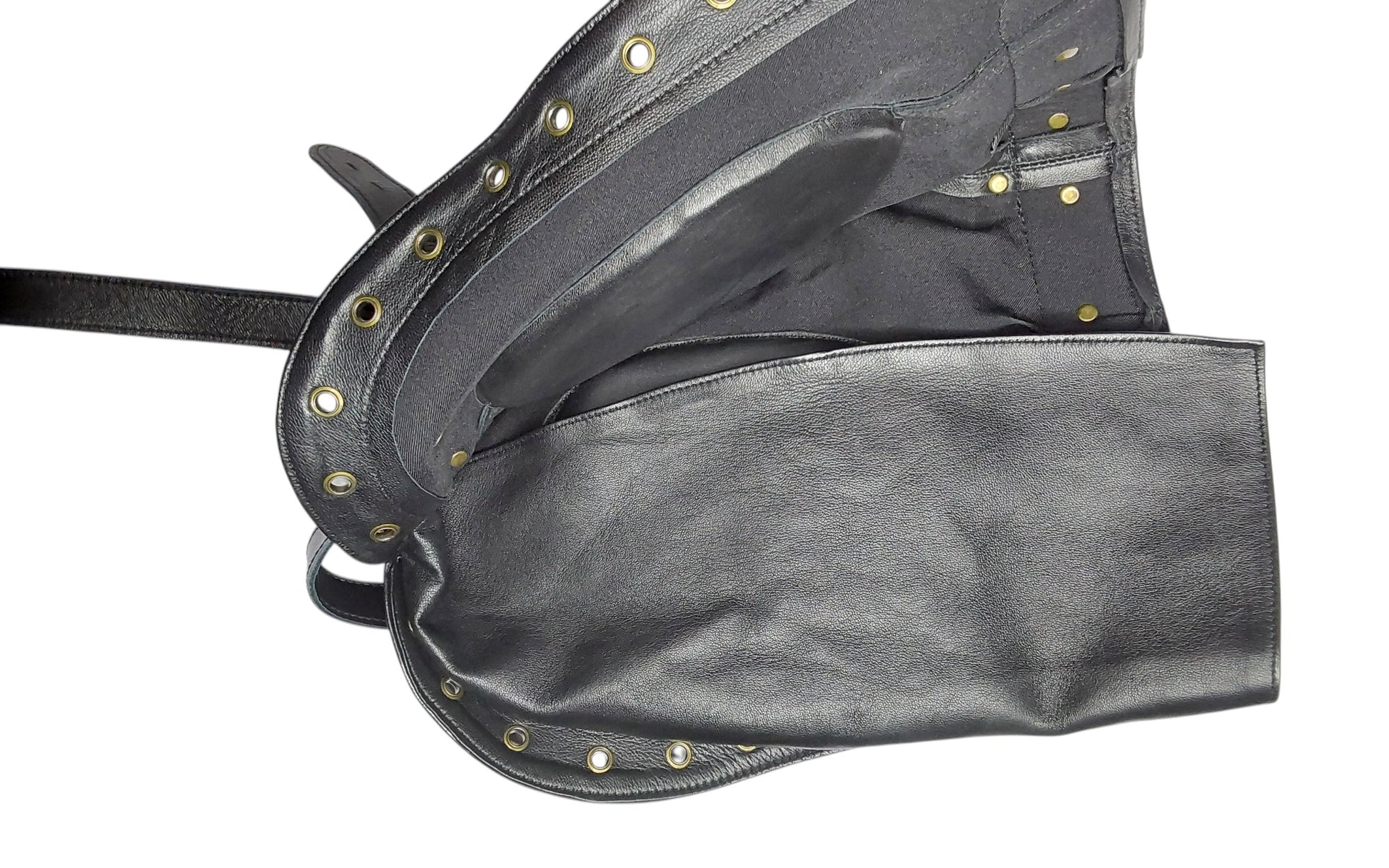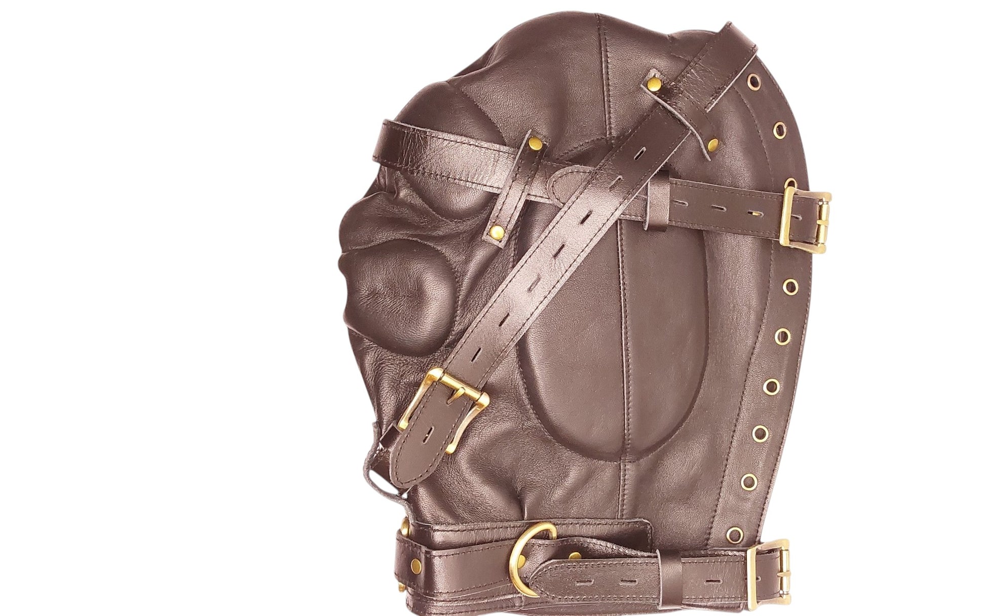 A premium black leather sensory hood designed to dampen sight and sound for deep-focus play. Fully lined for comfort with padded eyes, ears, and mouth, rear lacing for a custom wrap, and dual-buckle reinforcement. Finished with bronze-tone hardware.